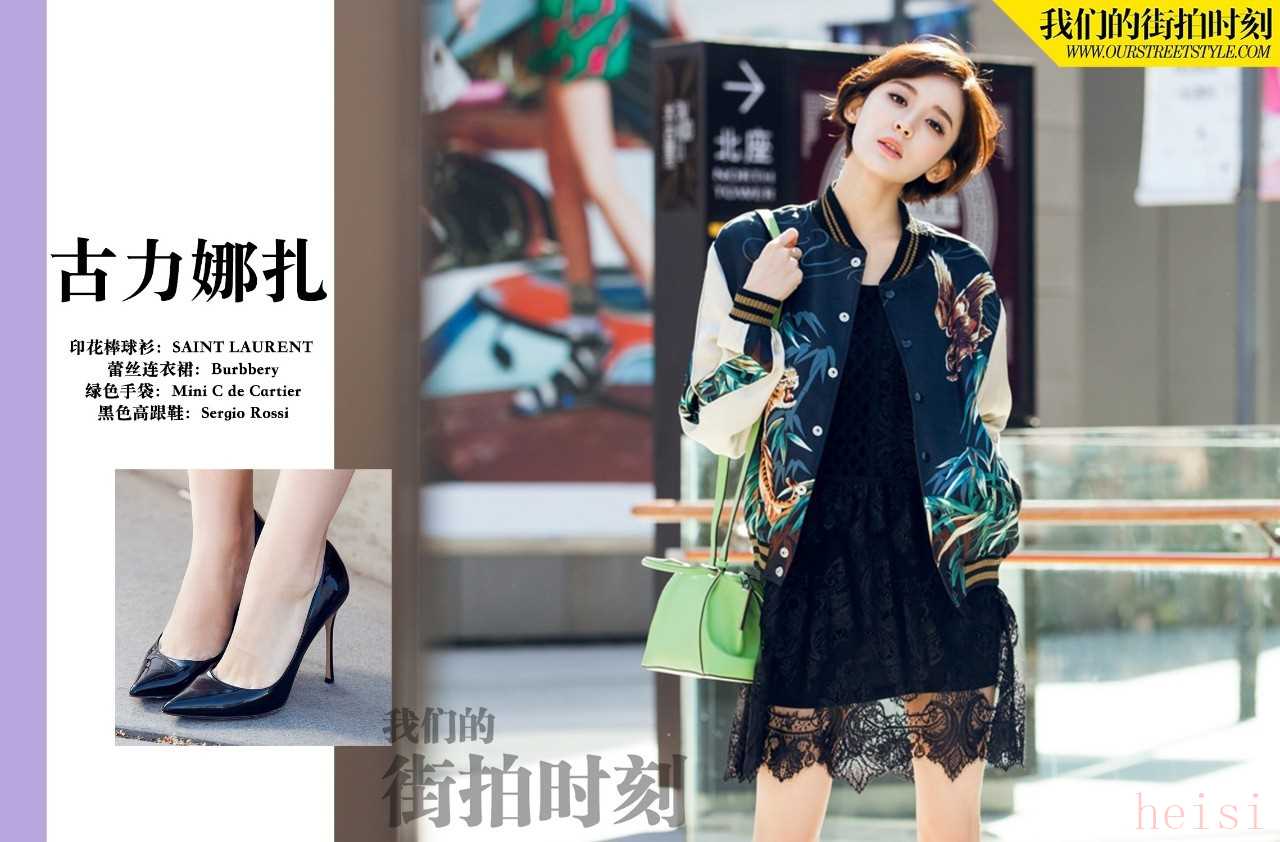 Tips:一身黑色蕾丝连衣裙搭配黑色尖头高跟出街,优雅大方的气质中透漏着性感。外加一件随性的印花棒球服,动感十足,浅绿色包包加以点缀,与内搭鲜明对比不仅搭配合理而且赢得更高的回头率。