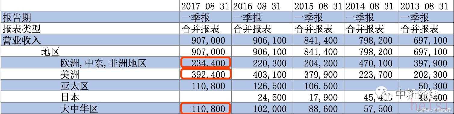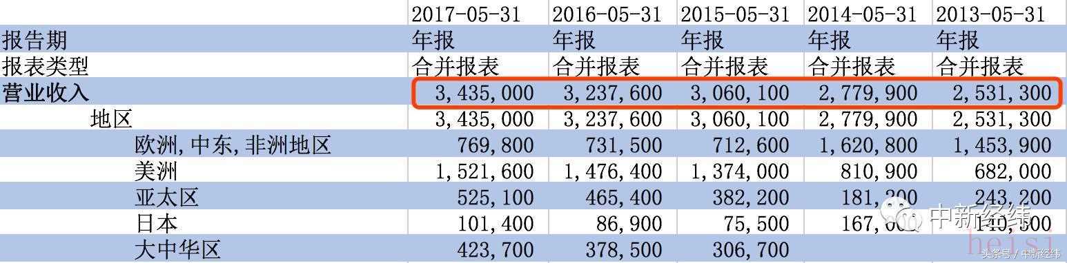 耐克部分主营地区2013财年至2017财年年报营业收入情况(单位:万元,币种:美元)
