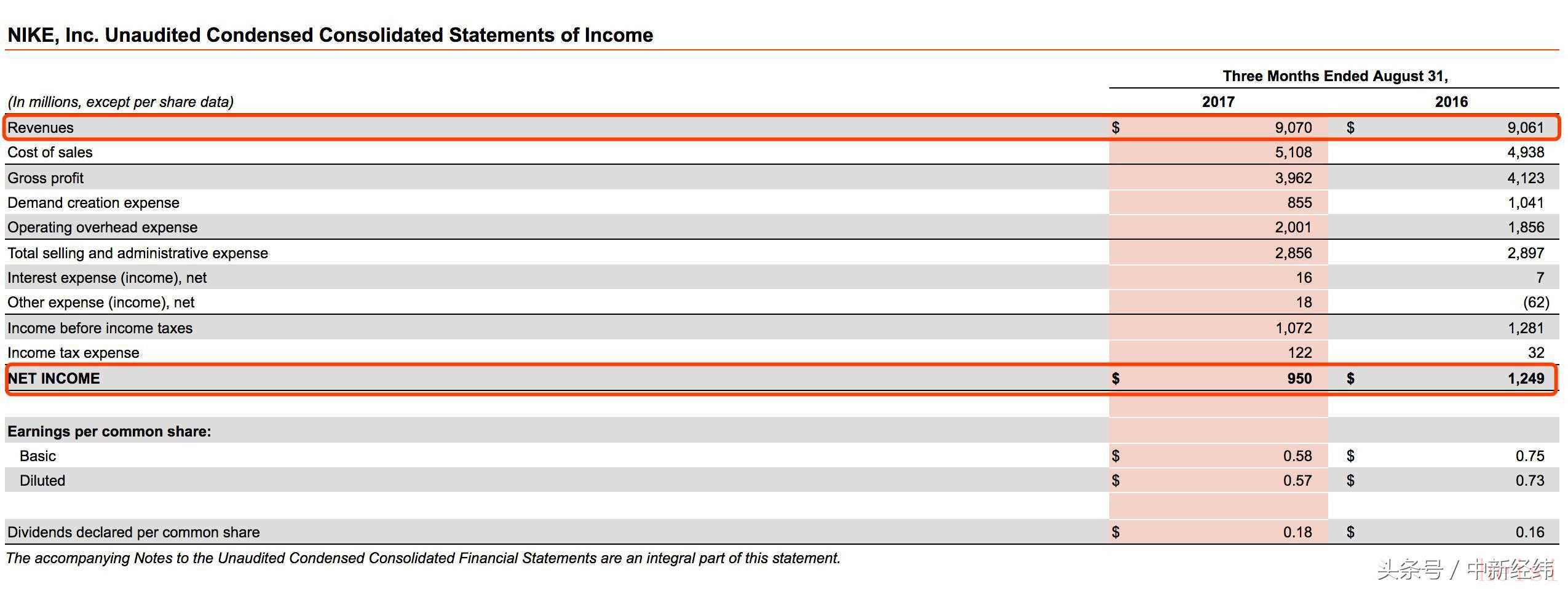 首先从总体来看,耐克最新一季(2017年5月31日-8月31日)财报显示,营业总收入90.7亿美元,同比增长0.1%;净利润9.5亿美元,同比下降23.94%。值得一提的是,从2010年以来,耐克每一财年一季度营业总收入同比增幅均高于5%。