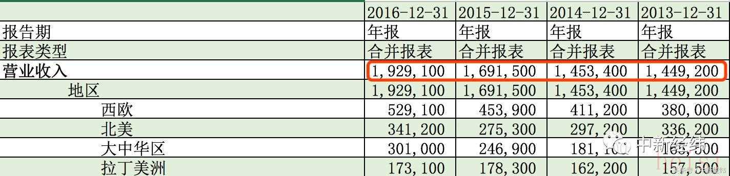 阿迪达斯部分主营地区2013-2016年年报营业收入情况(单位:万元,币种:美元)
