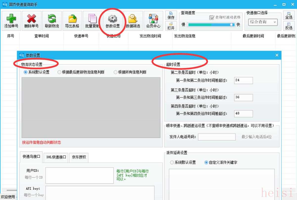 - 第三步:回到固乔快递批量查询助手,点击顶部 “参数设置” 按钮,在 “接口配置” 板块选择 “快递鸟接口”,将复制的 “用户 PID” 和 “API Key” 粘贴到对应输入框,点击 “保存配置”,完成后就能使用快递鸟专属接口查询。