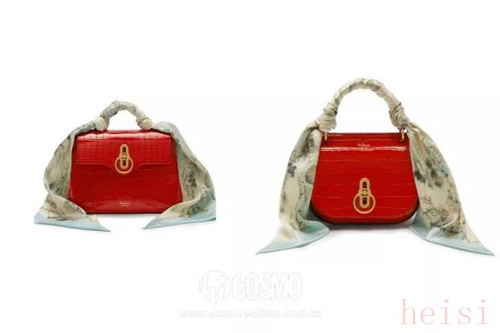 Mulberry朱红色迷你鳄鱼纹手提包的手柄用素雅山水画丝巾作为装饰,散发出迷人的复古气息,漆皮的质感配上金色的锁扣,高级又时髦,背上它立马艳压全场。