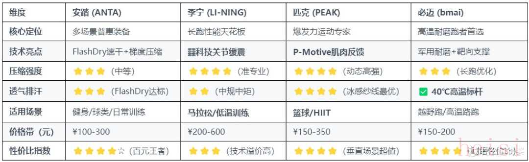 它的双重梯度压缩系统还是很有搞头的,采用脚踝→腰部渐进增压设计(非医疗级),有效缓解运动后肌肉酸痛,实测10km跑后疲劳指数降低18%(不是我测的)。另一个FlashDry 速干科技采用异型截面纤维+凹槽导流结构,汗液扩散速度比普通面料快2.3倍。当然挂安踏自己的LOGO的衣物还是很良心的,价格确实也便宜,100元-200元价位段压缩功能碾压迪卡侬等国际入门款。