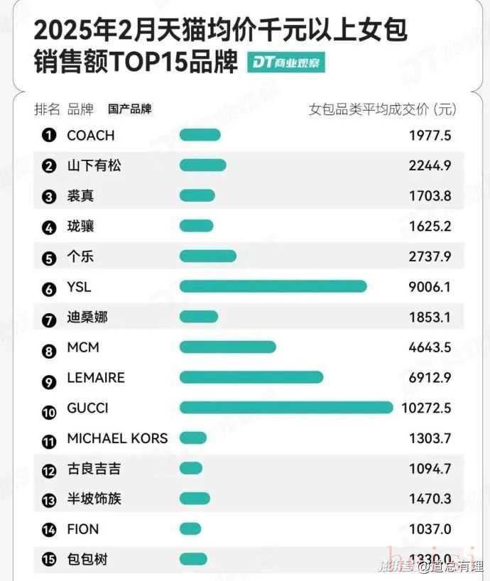 市场数据印证了这一现象:2025年2月,天猫千元以上女包品牌销售额TOP15中,国产品牌破天荒地占据了7席,与YSL、Gucci等奢侈品大牌分庭抗礼。山下有松和裘真更是直接冲入前三,仅落后于轻奢巨头COACH。