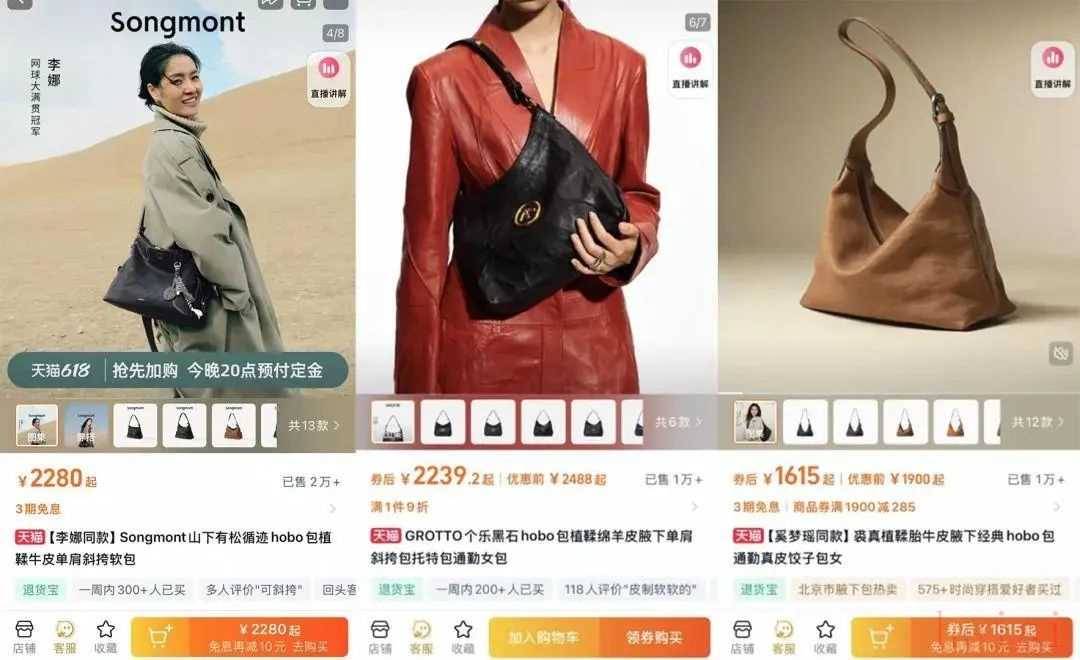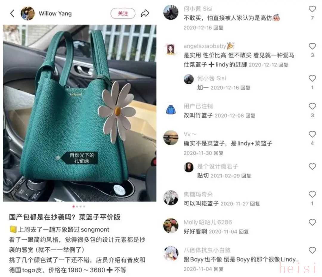 更尴尬的是陷入“平替困境”:山下有松的“菜篮子系列”曾被质疑是爱马仕Lindy和菜篮子的结合体。同时,千元国产包自身也出现“高仿”——有消费者以458元购入裘真“同款”托特包,声称材质同为头层植鞣皮,差别不大。