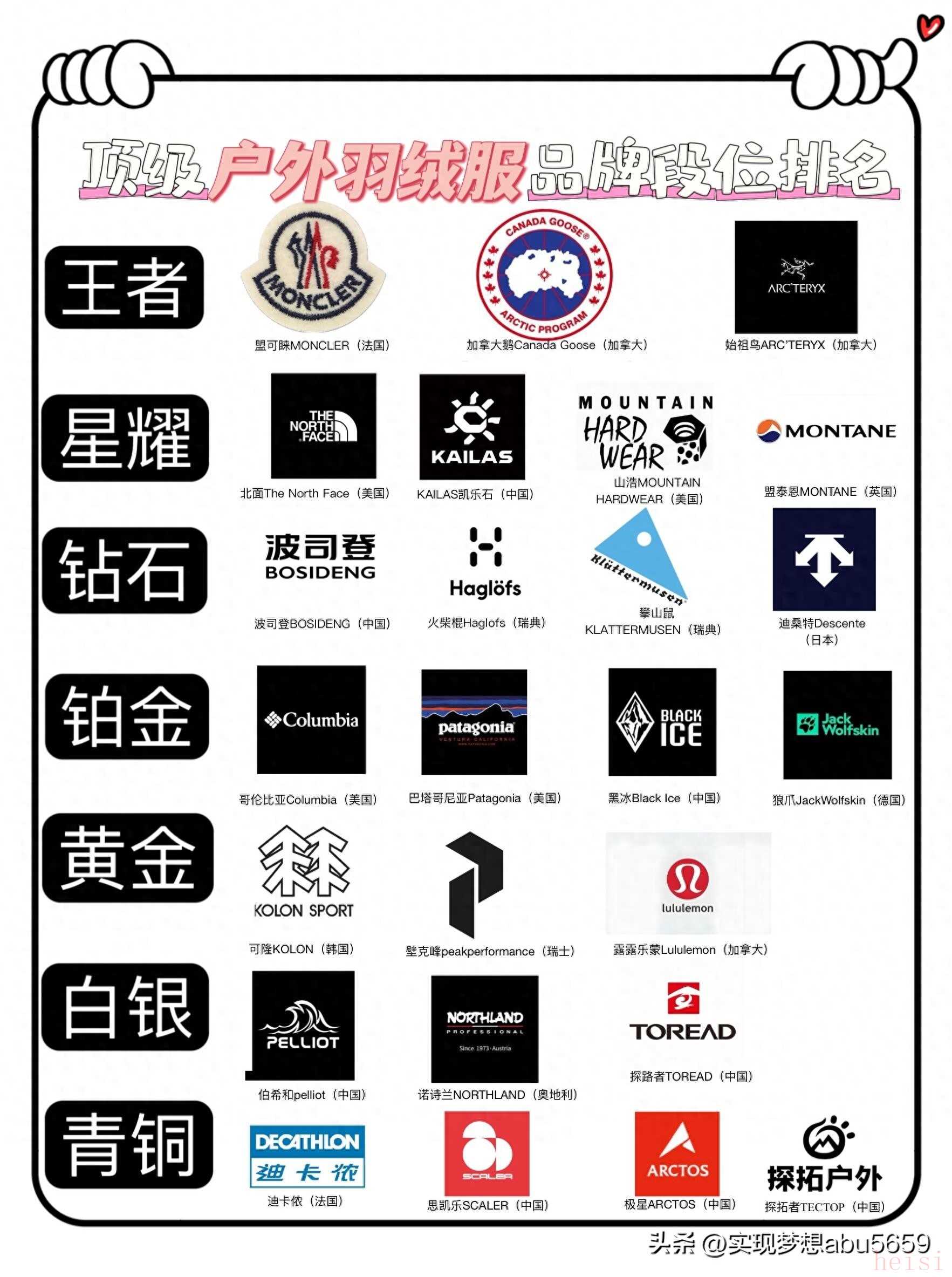 宝子们,激动的时候到了,今天一张图带你们了解户外羽绒服品牌的排名,以上排名仅代表个人见解哦