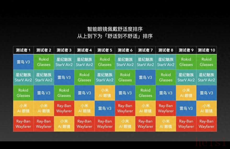 这种特殊的使用方式,意味着我们对智能眼镜的「人体工学表现」有着更高的要求。但很显然,对于这种带有主观色彩的测试,只参考小雷我一个人的意见是没有意义的。为此,我们特意了 10 位体验者,以对比排序的方式对五款佩戴舒适度排名。