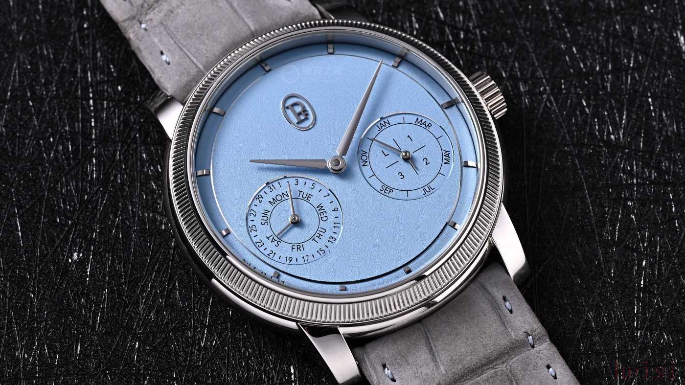 保持着简约风格的帕玛强尼,表壳没有任何突兀的棱角与外延,仅以流畅的线条。就连万年历盘面的设计上也是透过大胆巧妙的同轴显示,将星期与日期共享一根指针,月份与闰年现实则共享另一根指针,两个副盘对称放置在4点和8点位。把整个盘面大面积留白用以呈现基础时间指示,清爽又高级。950铂金材质表壳经过抛光打磨,并搭配滚花表圈,18K白金打造的表盘,以亮蓝色作为盘面颜色,并以手工打磨的粒面处理,搭配手工镶贴18K金镀铑时标和指针。