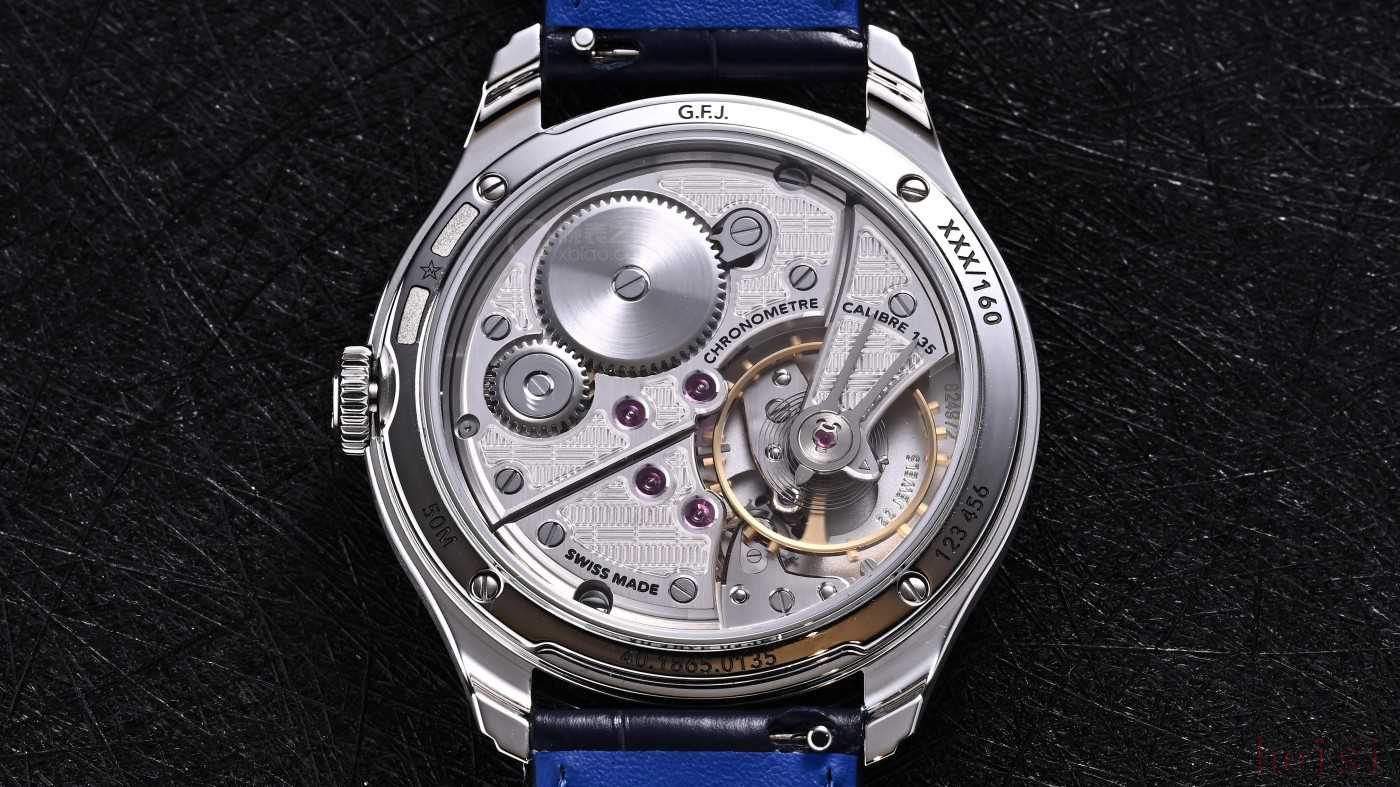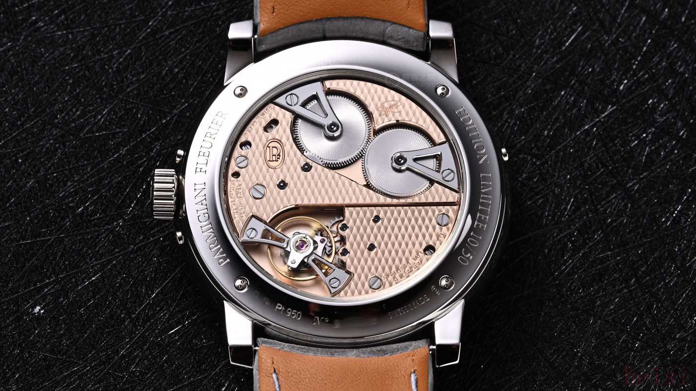 内部使用品牌自制的PF733手动上链机芯,以18K玫瑰金打造,桥板以纯粹的几何构造排列,并经过手工装饰有品牌独有的弗勒里耶波纹(Côtes de Fleurier)饰面。仅5.15毫米的机芯厚度,搭配双发条盒的设计,具备有60小时的动储能力。