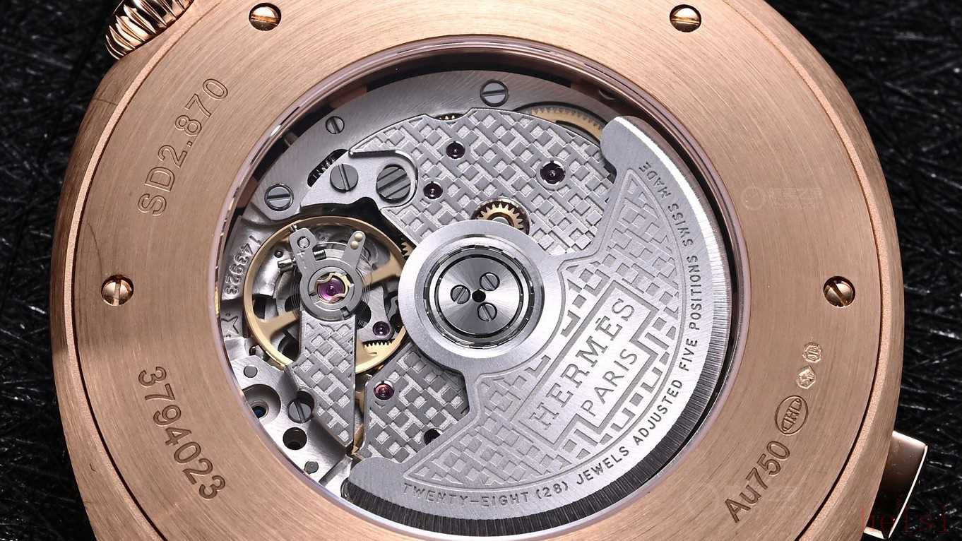 内部使用爱马仕自制H1912机芯,厚仅3.9毫米,振频28,800次/小时(4赫兹),能够提供45小时动力储存。底板装饰采用珍珠纹及漩涡纹打磨,夹板和摆陀经缎面处理并以爱马仕H字标志纹理装饰。时间暂停模块则以珍珠纹和日内瓦波纹装饰。