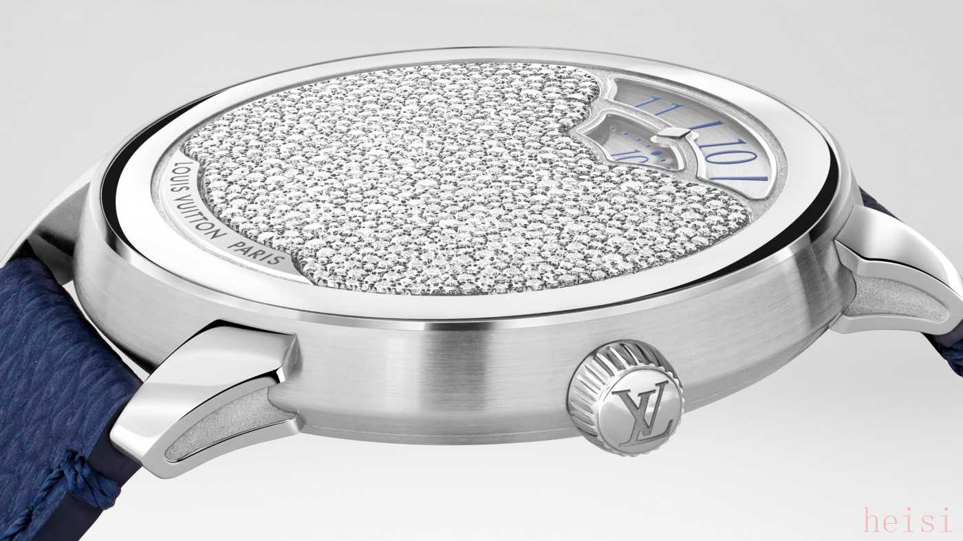 在女士表的提名中,路易威登的Tambour Convergence铂金钻石腕表(型号:W9PT11)实在是令人惊艳。通过12点位两个旋转圆盘的交错来显示小时与时间,时针顺时针旋转于上方弧形小窗,分针则显示于下方弧形窗口,并且用铂金质地的菱形指针作为标识,通过一种拖拽式的时间指示方式,清晰易读的同时,将也为盘面创造了大面积的留白美学,延续路易威登一贯的美学理念。
