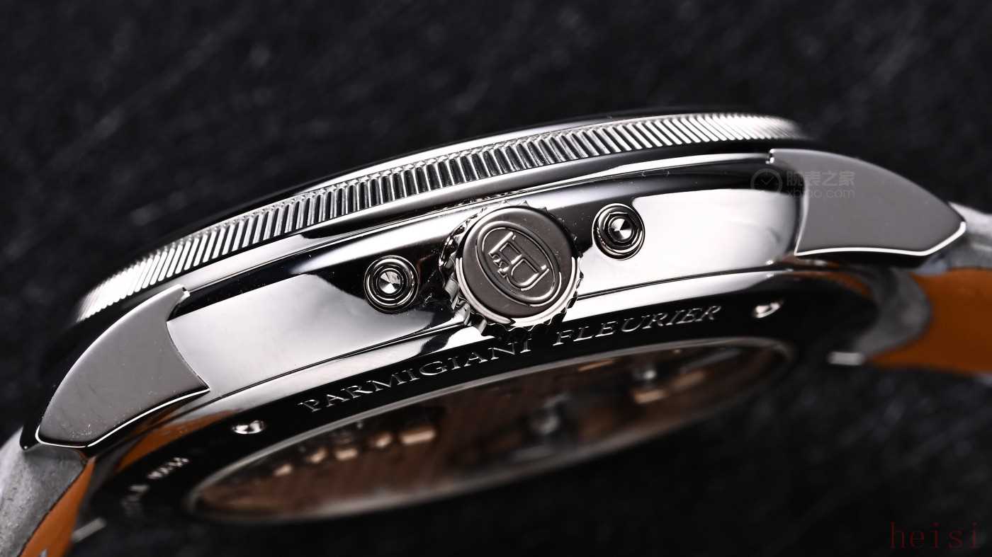 似圆非圆的750 5N级缎光玫瑰金表壳,39毫米的表径,大部分经过拉丝打磨,纺锤形部分采用抛光润饰。表盘采用红色太阳纹搭配中间部分的细腻喷砂装饰,阿拉伯数字时标和棍状指针均搭配Super-LumiNova® 夜光涂层。4点位处的小秒盘以逆时针旋转并每24秒转完一圈。最独特之处在于盘面的12点位设有时间暂停区域,通过8时位置的时针和分针便会自动收纳到位于12点的扇形区域,再次按下按钮两根指针便会自动恢复显示当下时间。