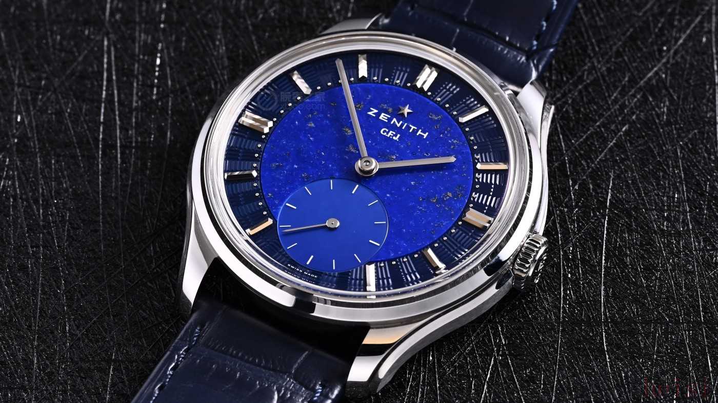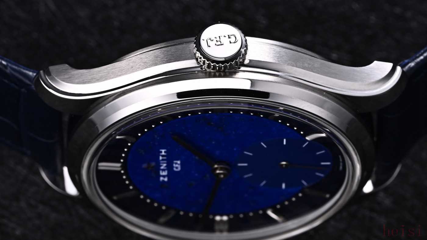 39毫米的铂金表壳,10.5毫米的厚度,再加上十分优雅的阶梯式表耳和表圈,表壳侧面经过拉丝处理,表圈以及表耳进行抛光。小三针的盘面上使用三种不同的蓝色将盘面分割成三个部分,盘面外缘饰以与机芯装饰相同的玑镂花纹,致敬真力时表厂的外墙。中央盘面则以青金石材质呈现繁星夜空,6点位处的小秒盘则链接盘面内圈与外圈,以珍珠母贝材质制作而成。再搭配上由白金制作而成的立体时标、珠粒式分钟刻度、以及指针,绝对奢华。