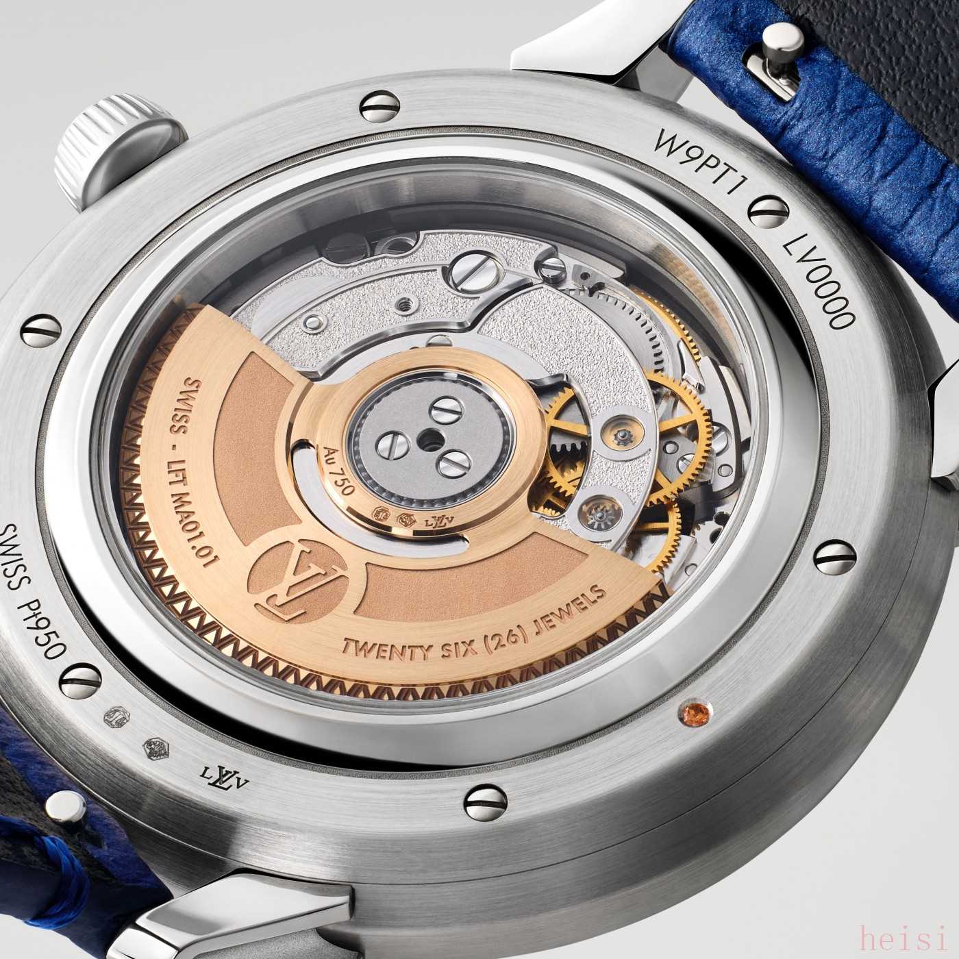 内部搭载品牌首款完全由路易威登La Fabrique du Temps高级制表工坊自主打造的LFT MA01.01自动上链机械机芯,45小时动储能力,4赫兹(28,800次/小时)的振频。透过背透能看到高惯性18K玫瑰金摆陀为机芯发条盒高效上链,表桥经喷砂处理,摆陀外缘抛光并饰有V型倒角等多重装饰。