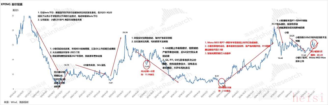 后 P7+ 和 Mona M03 上市,相比同级竞品极具性价比,通过高性价比 + 高颜值 + 长续航 + 智能化优势占据市场,成功打造成爆款,而公司的本轮产品强周期从 2024 年一直持续到 2026 年,小鹏基本面发生了强反转,这也带动了小鹏的股价从最低点 7 美元迅速拉涨 276% 至 2025 年 1 月最高点 26 美元。