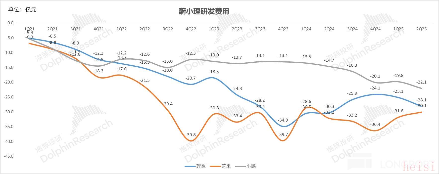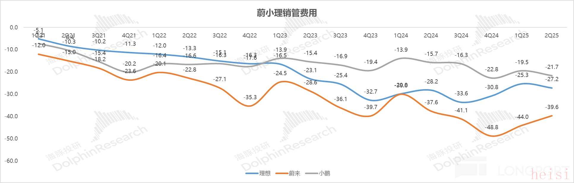 蔚来指引三季度因为新品推出,营销费用下滑程度难,但到四季度,Non-GAAP 下的 SG&A 费用目标控制在销售收入的 10% 以内,海豚君预计按照指引,四季度销售费用将从二季度的 40 亿元环比继续下滑 5-6 亿元至 34-35 亿元。虽然仍高出理想和小鹏的销管费用,但是蔚来主要用高端服务 + 豪华的 Nio house 来塑造高端品牌感,这部分费用继续下调的空间不大。