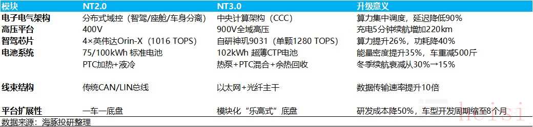 而此次升级的 NT3.0 平台,不仅在续航 + 快充纯电的核心痛点上进行了升级,同时在舒适性配置上也标配 “冰箱彩电大沙发”,大幅改进 NT2.0 平台车型的定义失误问题。