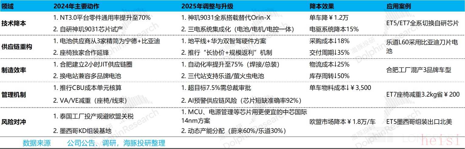 自研芯片降本:蔚来自研 NX9031 芯片,这也是成本降幅最大的地方,NT2.0 是 4 颗英伟达 Orin-X 芯片,每辆车成本降低 1 万元,