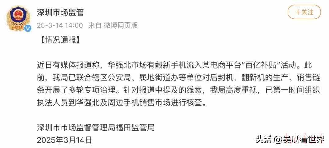 当新京报曝出华强北存在大量翻新机流向百亿补贴后,深圳市场监管部门及时做出回应,根据情况通报显示。