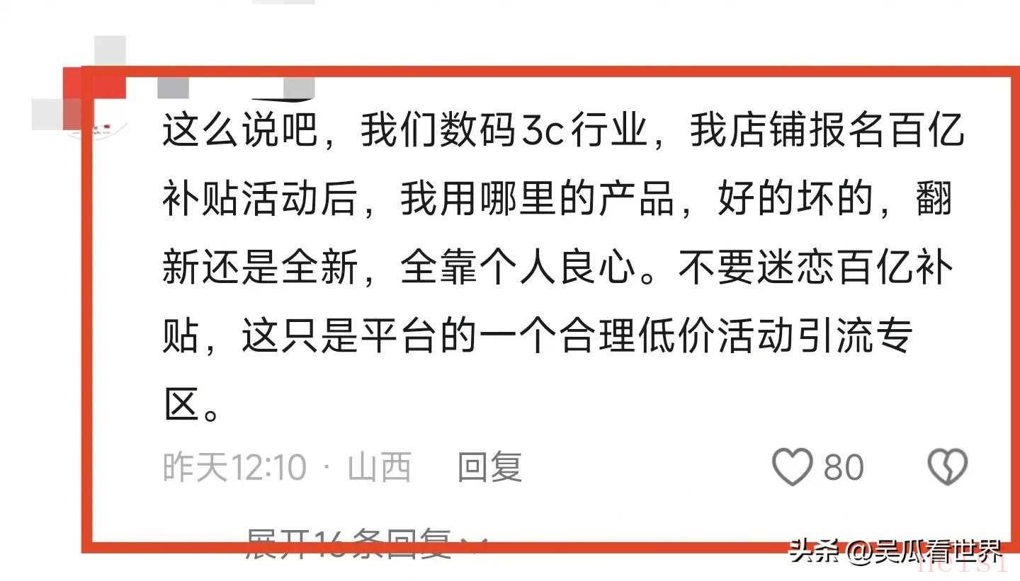 一位经销商表示:“在我们数码3C行业,我的店铺报名百亿补贴活动后,我用哪里的产品,好的坏的,翻新还是全新,全靠个人良心,不要迷恋百亿补贴,这只是平台的一个合理低价活动引流专区”。
