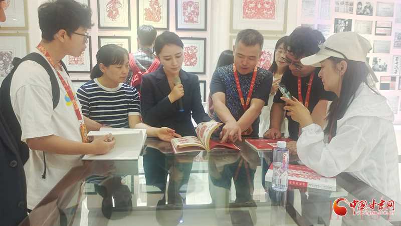 常燕正在为媒体记者和网络名人讲解庆阳剪纸纹样