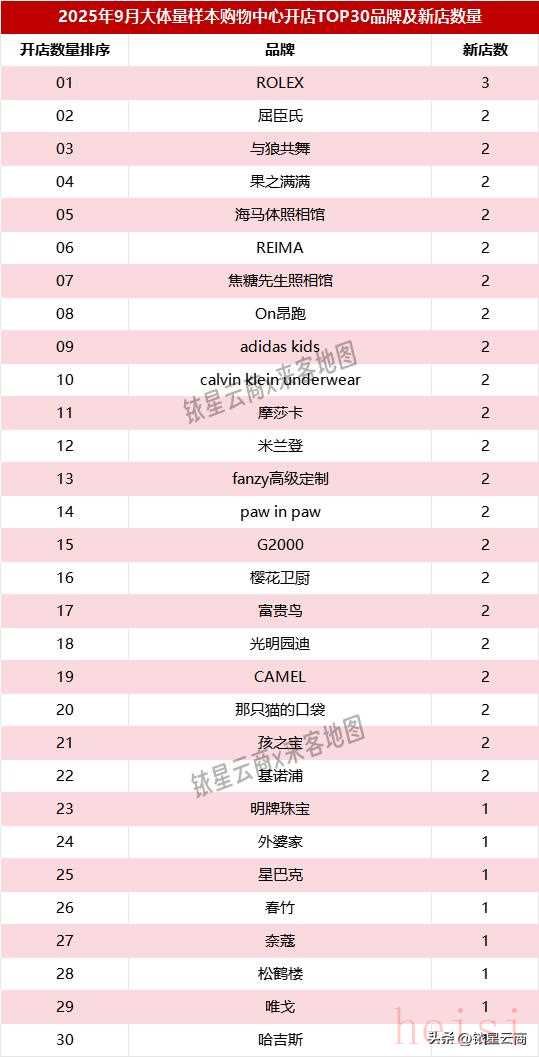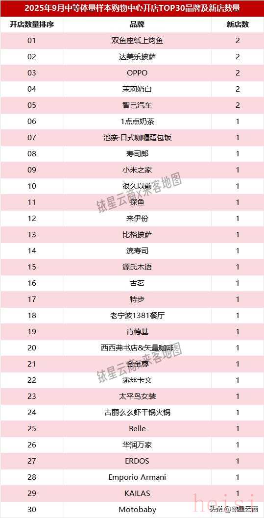 武商MALL劳力士精品店,图源:武商潮儿童业态在此维度9月拓展成绩亮眼,6个品牌开出12家新店,包括4个童装童鞋品牌的8家新店、2家孩之宝玩具店和2家光明园迪的儿童家具电器新店。餐饮业态布局谨慎,仅4个品牌开出5家新店。生活服务业态中2个品牌均为摄影,即海马体照相馆和焦糖先生照相馆各开出两家新店。4.30座中等体量样本购物中心开店TOP30品牌及新开门店数在30个中等体量样本购物中心中,9月开店数量排序TOP30品牌包括双鱼座纸上烤鱼、达美乐披萨、OPPO、茉莉奶白、智己汽车、1点点奶茶、池奈·日式咖喱蛋包饭、寿司郎、小米之家、很久以前、探鱼、来伊份、比格披萨、滨寿司、源氏木语、古茗、特步、老宁波1381餐厅、肯德基、西西弗书店&矢量咖啡、金至尊、露丝卡文、太平鸟女装、古丽么么虾干锅火锅、Belle、华润万家、ERDOS、Emporio Armani、KAILAS、Motobaby。其中,双鱼座纸上烤鱼、达美乐披萨、OPPO、茉莉奶白、智己汽车等5个品牌分别各开出2家店;自1点点奶茶至Motobaby等25个品牌均各开出1家新店。