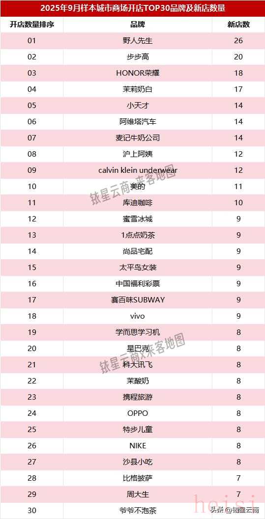 麦记牛奶公司门店,图源:项目官方此外,生活服务业态9月“升温”,尤其中国福利彩票和中国体育彩票共计开出44家新店。2.20座样本城市商场开店TOP30品牌及新开门店数9月,20座样本城市商场中,按开店数量排序TOP30品牌如下有:野人先生(26)、步步高(20)、HONOR荣耀(18)、茉莉奶白(17)、小天才(14)、阿维塔汽车(14)、麦记牛奶公司(14)、沪上阿姨(12)、calvin klein underwear(12)、美的(11)、库迪咖啡(10)、蜜雪冰城(9)、1点点奶茶(9)、尚品宅配(9)、太平鸟女装(9)、中国福利彩票(9)赛百味SUBWAY(9)、vivo(9)、学而思学习机 (8)、星巴克(8)、科大讯飞(8)、茉酸奶(8)、携程旅游(8)、OPPO(8)、特步儿童(8)、NIKE(8)、沙县小吃(8)、比格披萨(7)、周大生(7)、爷爷不泡茶(7)。