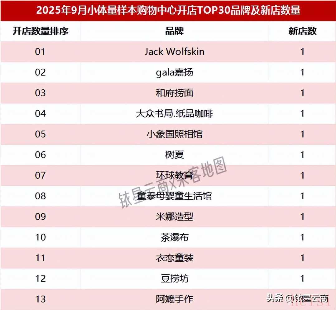 达美乐门店,图源:红餐网拍摄5.30座小体量样本购物中心开店TOP30品牌及新开门店数9月,30个小体量样本购物中心仅有13个品牌各开出1家新店。分别是Jack Wolfskin、gala嘉扬、和府捞面、大众书局.纸品咖啡、小象国照相馆、树夏、环球教育、童泰母婴童生活馆、米娜造型、茶瀑布、衣恋童装、豆捞坊、阿嬷手作。