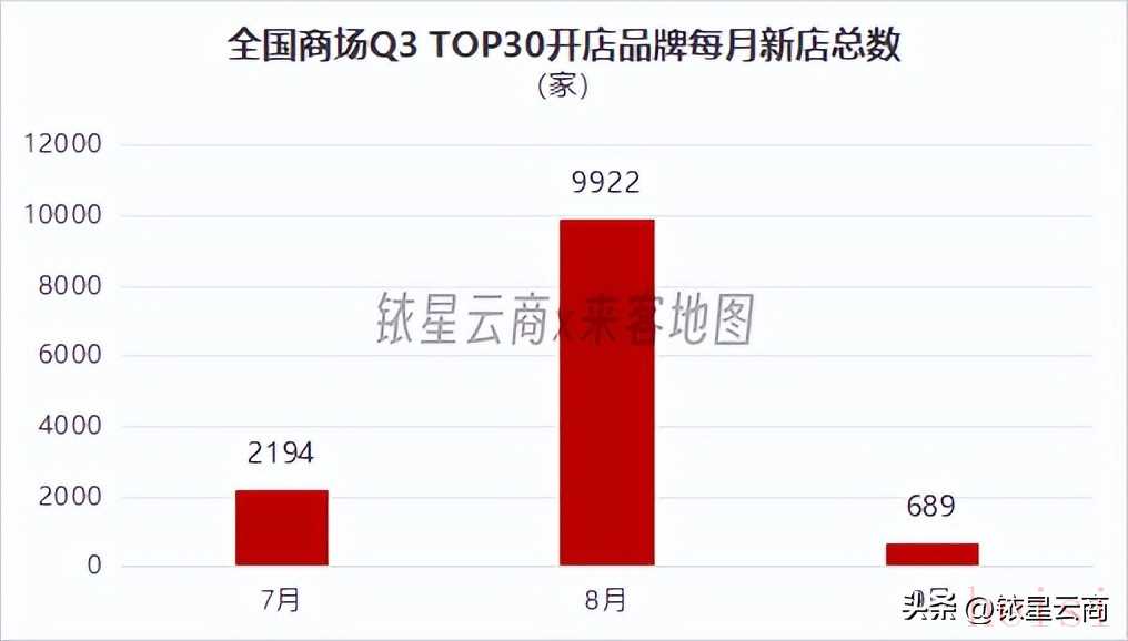从总数来看,全国商场9月TOP30开店品牌共布局689家店,比8月9922家大幅减少9233家,环比“断崖”下降93.1%。为今年三季度TOP30开店品牌新店总数最少的月份,显示出品牌商对拓店的谨慎。