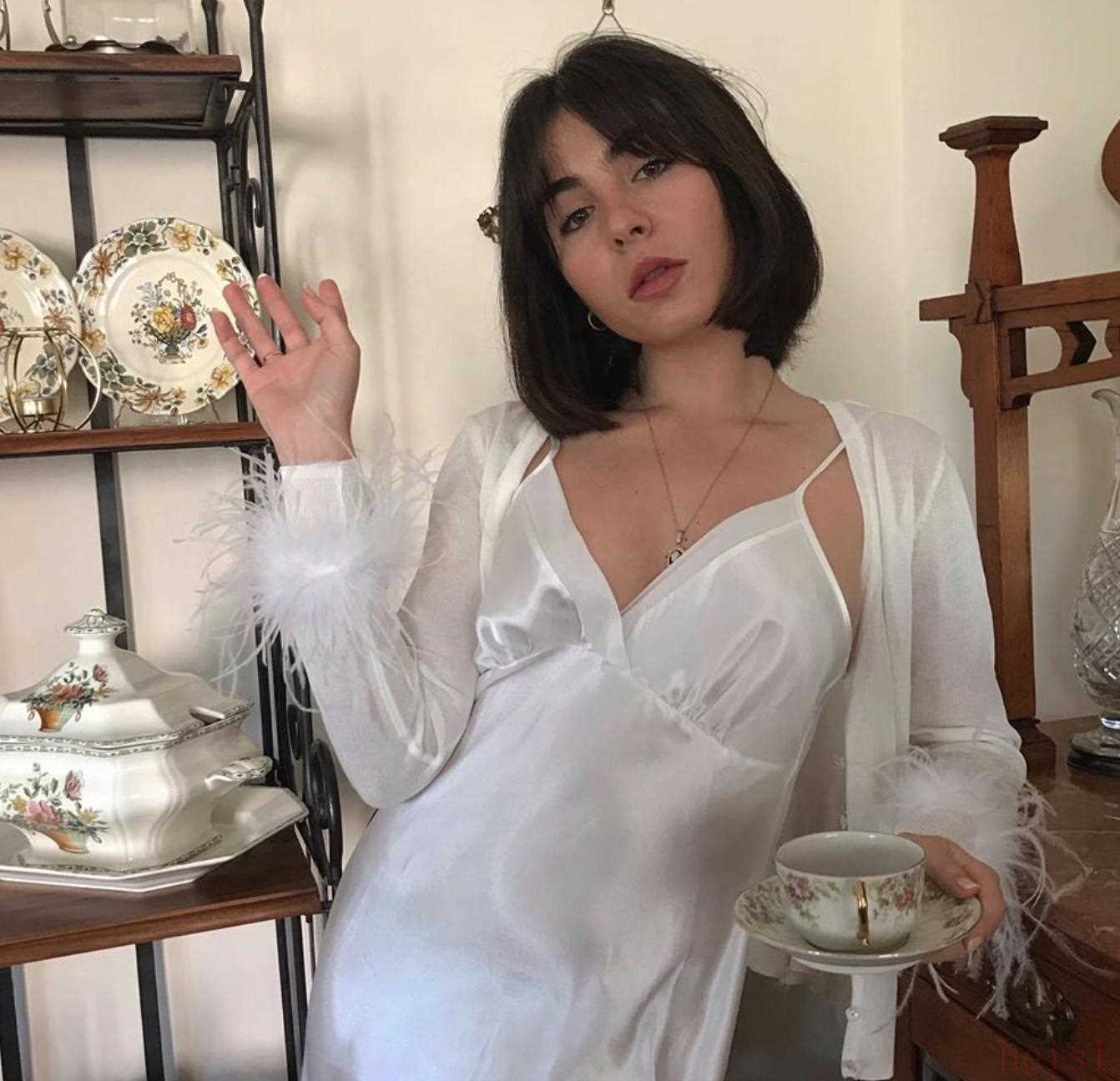 知名时尚记者兼设计师Marta,穿上这件白色丝质连身睡衣并搭配以羽毛点缀的小外套;如果您想要一件慵懒又不失性感的睡衣,就选这套吧!