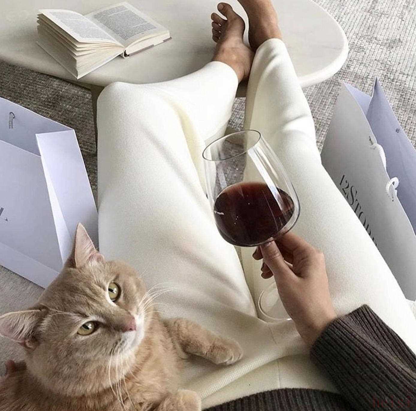 法国知名部落客Ana以白色棉裤搭配舒适居家上衣,配上一杯红酒与猫咪作伴,就算宅在家也不无聊!