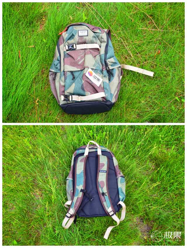 十分不巧的笔者胸椎受了点小伤,无法做背负展示,只能给大家做静物展示。可以看到Burton Kilo双肩背包的迷彩配色只是一种装饰配色,放在环境背景之中还是比较醒目的,并无真正迷彩的伪装效果。