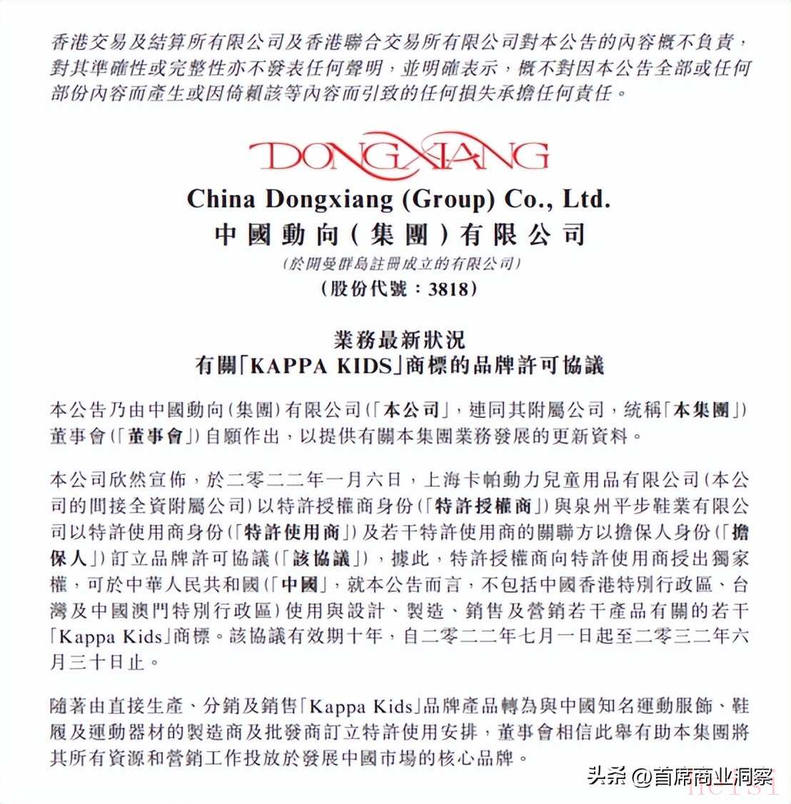 2022年初,Kappa母公司中国动向发布公告,将中国内地Kappa Kids商标独家使用权卖给泉州平步鞋业,期限为10年。