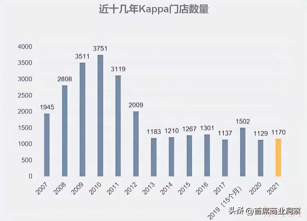 门店数量从巅峰时的4000骤降到1000家。很多一线城市的Kappa门店,要么在商场不显眼处,要么干脆闭店。