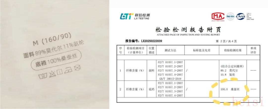 不搞文字游戏,检测报告清晰标注:100%桑蚕丝的底裆;