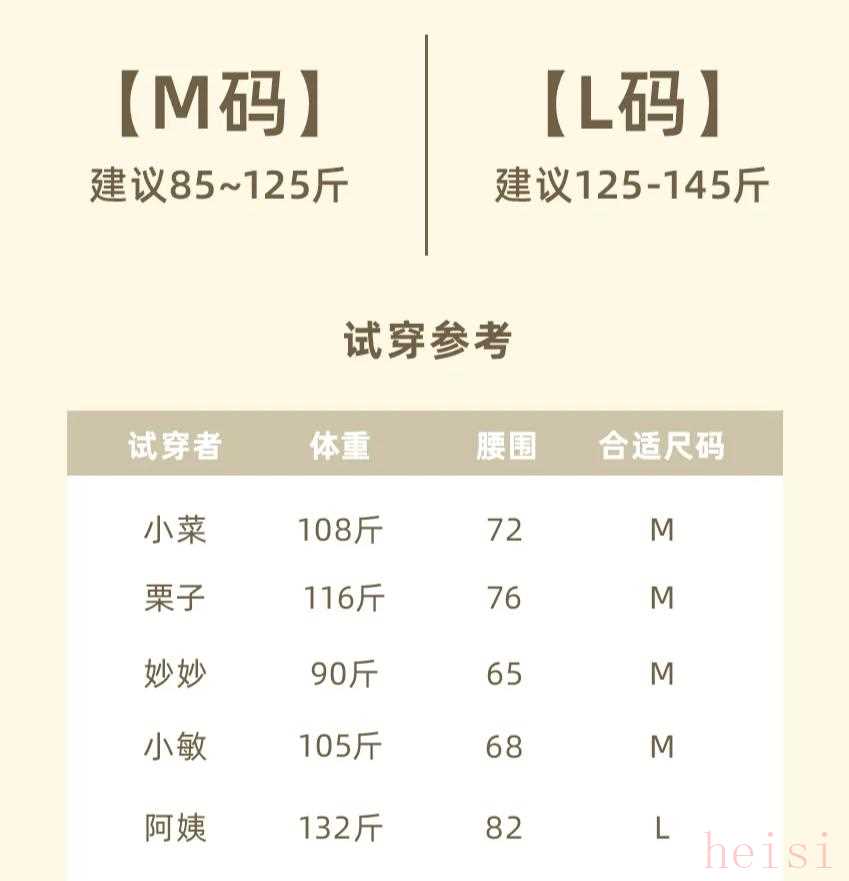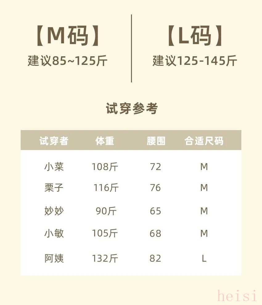 两个尺码可选,M码从85斤能穿到125斤,L码可以从125斤穿到145斤。