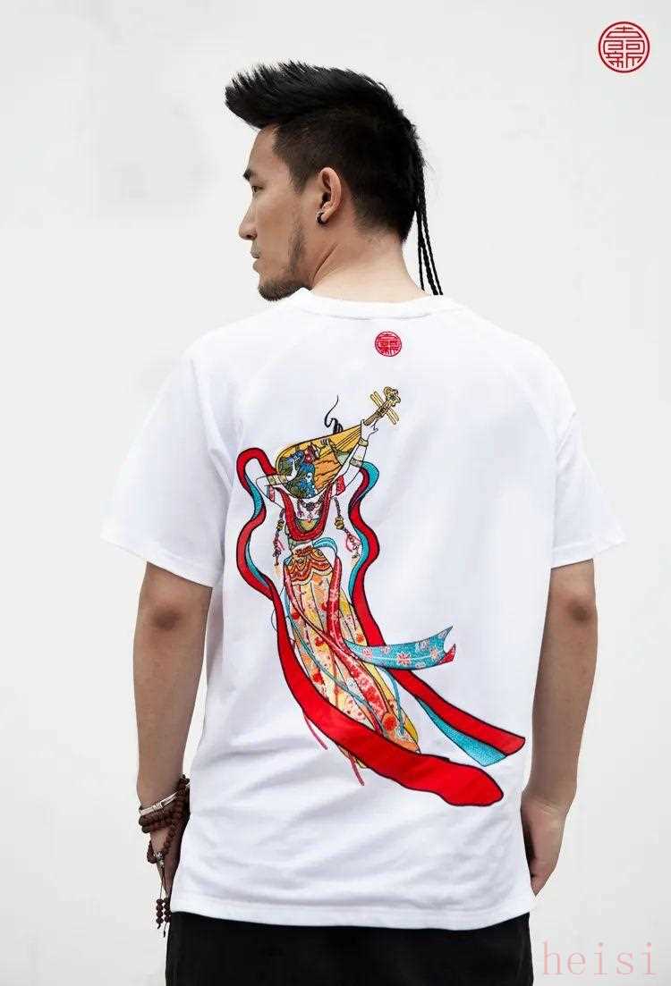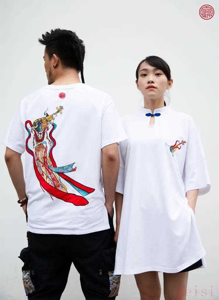 同时,这款“飞天仙女款”分男女款。男版采用鸡心领擦肩T恤版型,更显阳刚之气。女版立领手工小盘扣,两边为开衩包边设计,整体版型为中长T恤短裙。