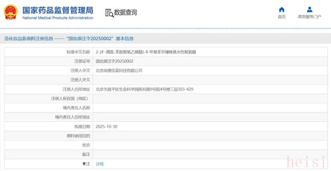 10月30日,一款新原料“2-(4'-偶氮-苯胺聚氧乙烯醚)-4-甲基苯并噻唑基水性聚氨酯”完成备案,备案人为北京尚捷优蓝科技有限公司。