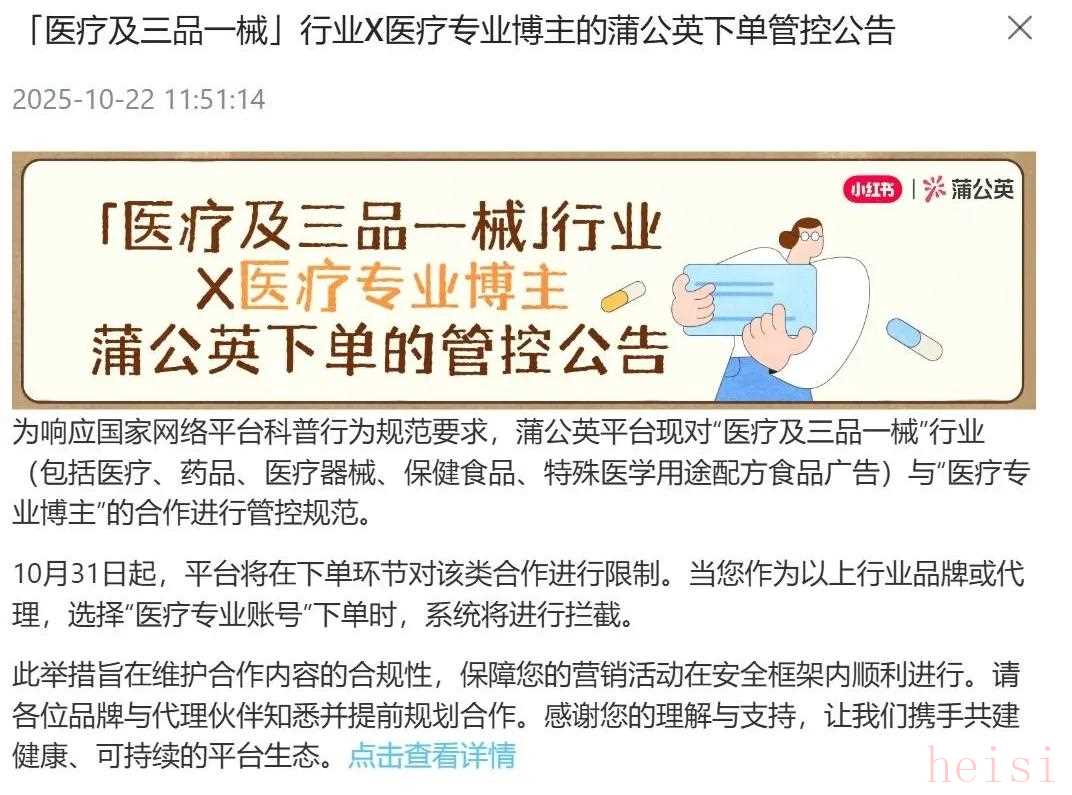 近日,小红书蒲公英发布公告,宣布自2025年10月30日起,全面限制“医疗及三品一械(药品、保健食品、特殊医学用途配方食品和医疗器械)”行业与平台认证的“医疗专业博主”之间的商业合作。
