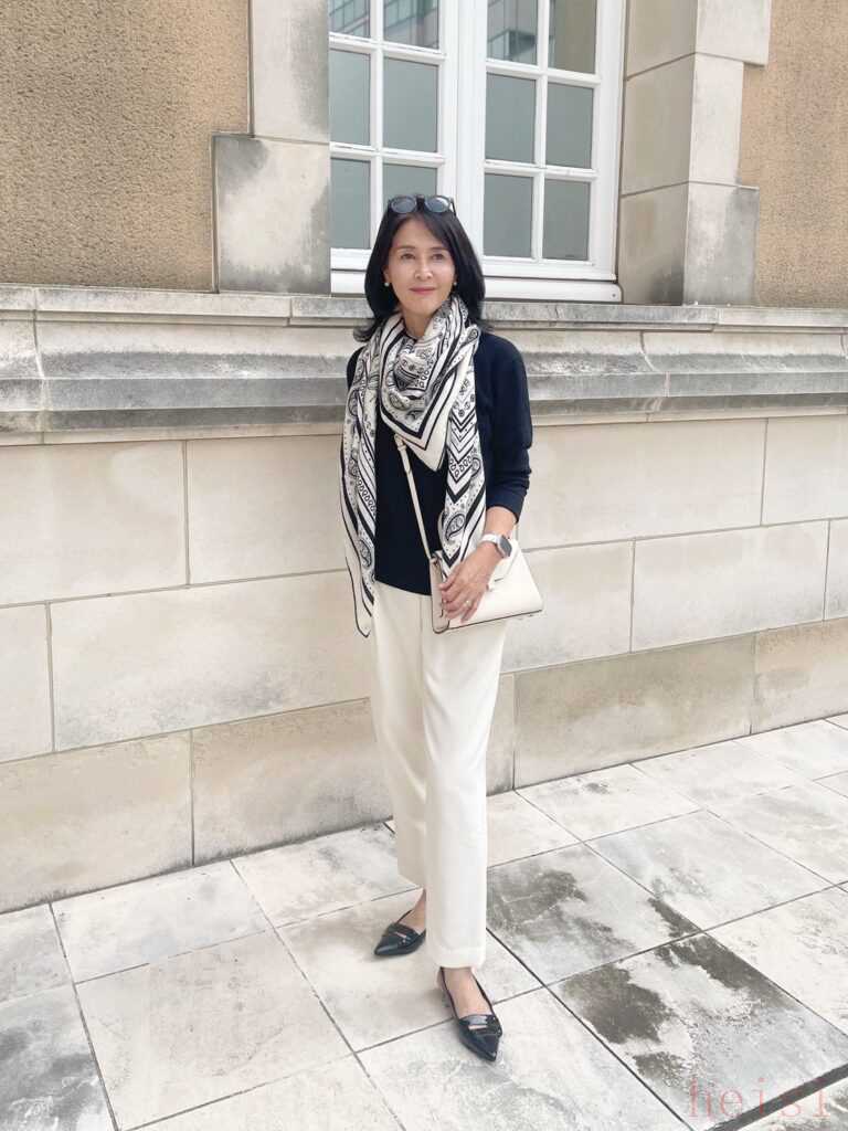 黑色针织×白色裤子的超简单组合,柔软地包裹在大披肩中,增添了季节感。脸部周围变得更明亮,给人一种优雅的印象。