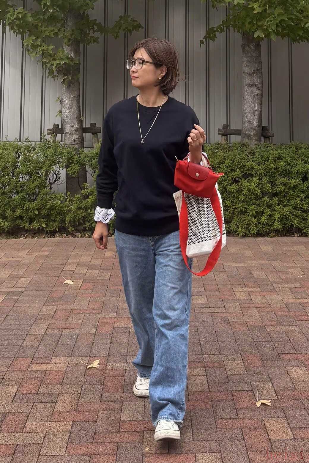 对于经典的牛仔搭配,用今年经常看到的蕾丝配饰为五六十岁的成熟女性增添适量的甜蜜。配上一个红色的包包,意识到了一种不太简单的华丽风格。