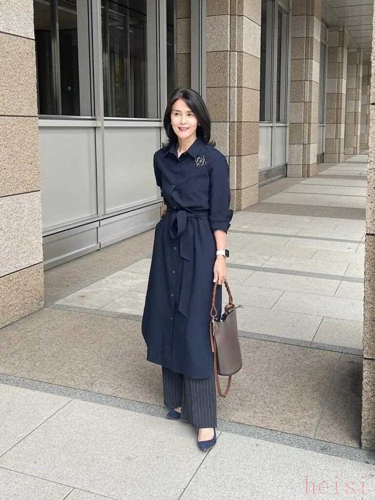 给人一种沉稳印象的海军蓝衬衫裙,叠穿细条纹裤子,增添深度。胸前的胸针增添了微妙的魅力,使其成为外出的完美成熟装束。