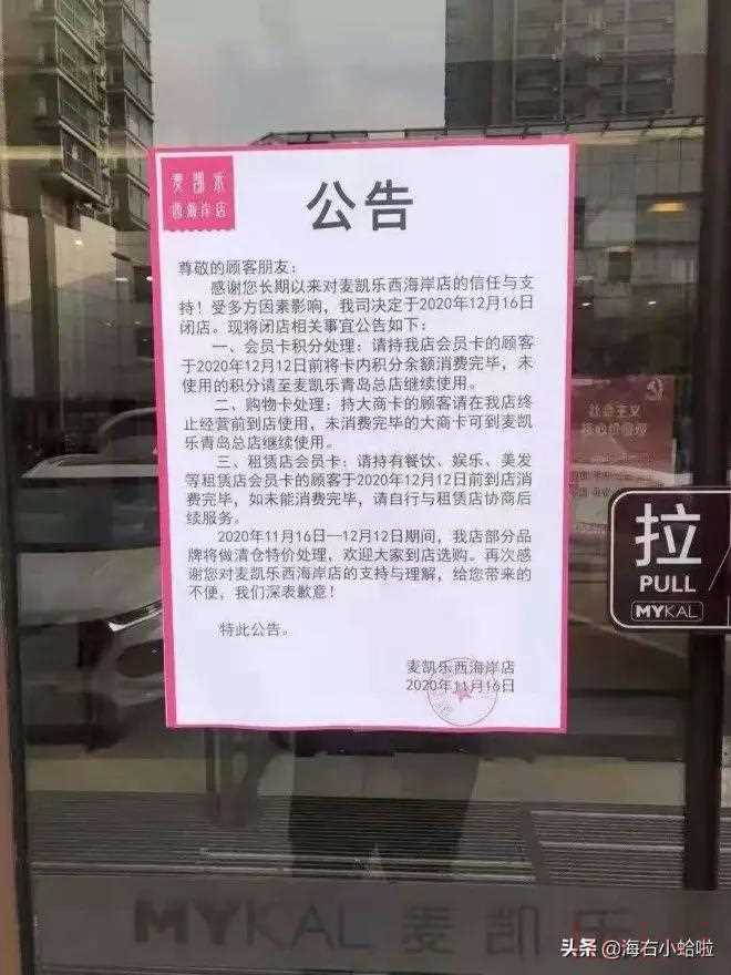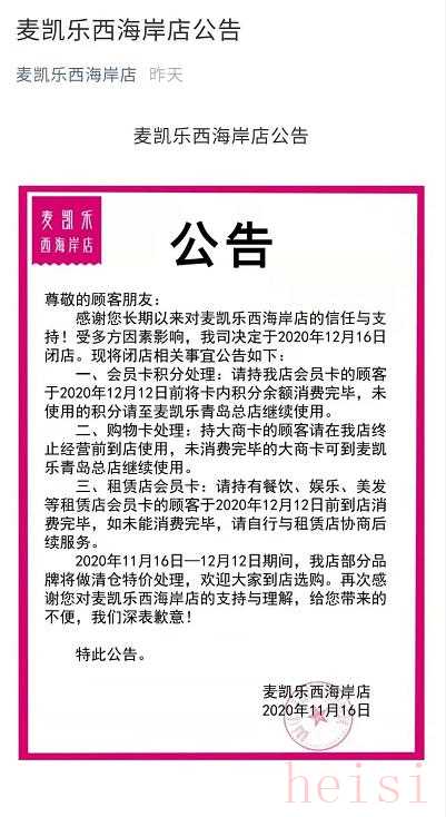 11月16日,一则麦凯乐青岛西海岸店的关店公告在网上流传。