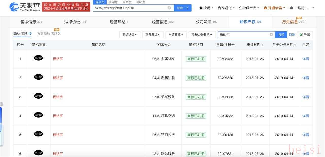 记者通过天眼查APP查询看到,目前济南杨铭宇餐饮管理有限公司已注册四十余个杨铭宇商标,涵盖食品、方便食品等多个类别。