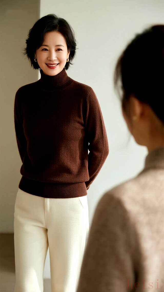 深棕色半高领针织衫配米白色修身长裤,成为2023-2024年中老年女士秋冬穿搭的新宠,显然不是偶然。这对搭配在成熟女性中引发的热议,揭示了市场背后的一些真实变化。原本只被视为保暖实用的服饰,如今被赋予了时尚标签,这其中隐藏的商业逻辑和消费者心理,也值得深究。