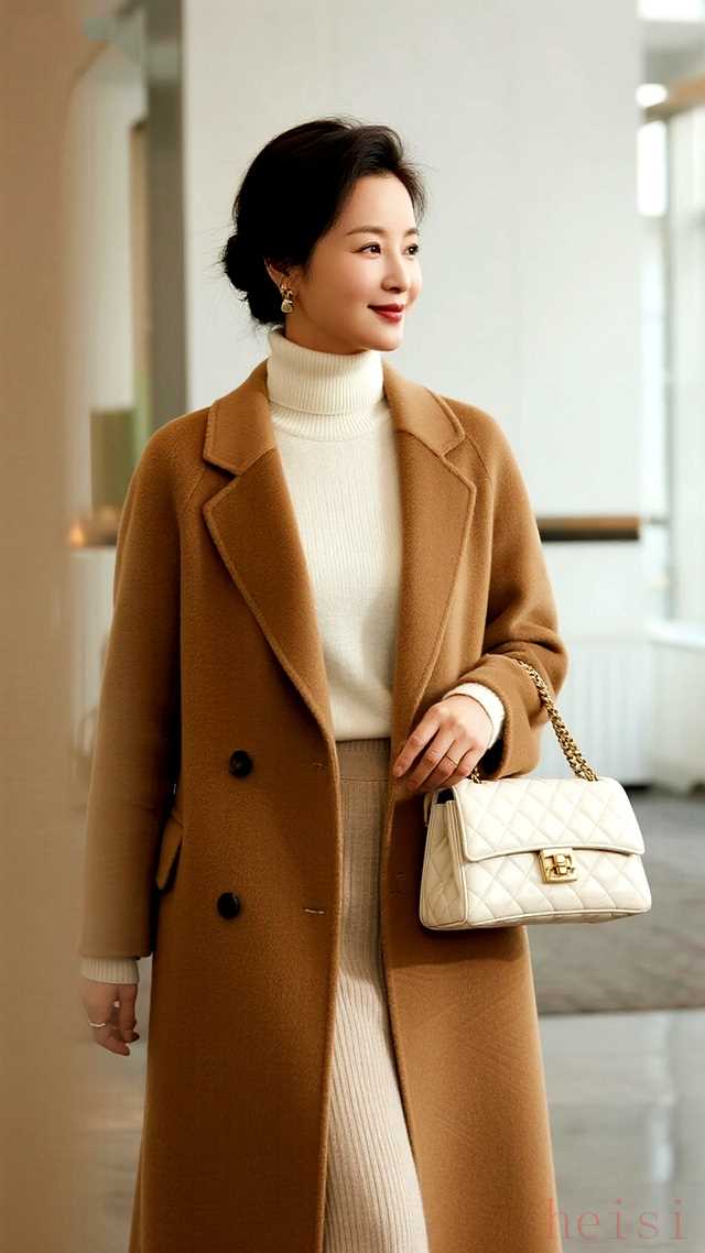 为一位中老年女士推荐冬季穿搭,以“开襟卡其色长款无扣羊毛大衣”为核心单品,可以打造出既舒适实用,又不失优雅气质的造型。以下是一些搭配建议和思路: