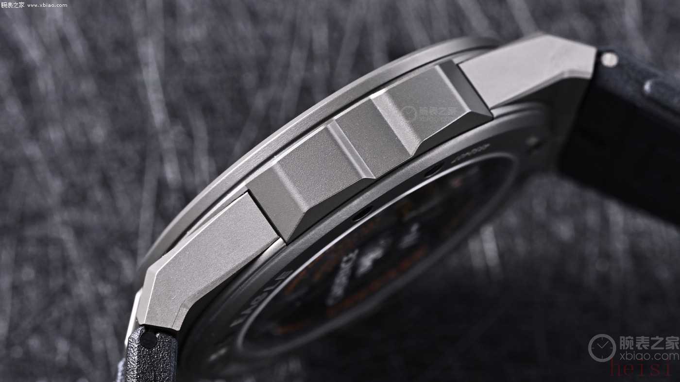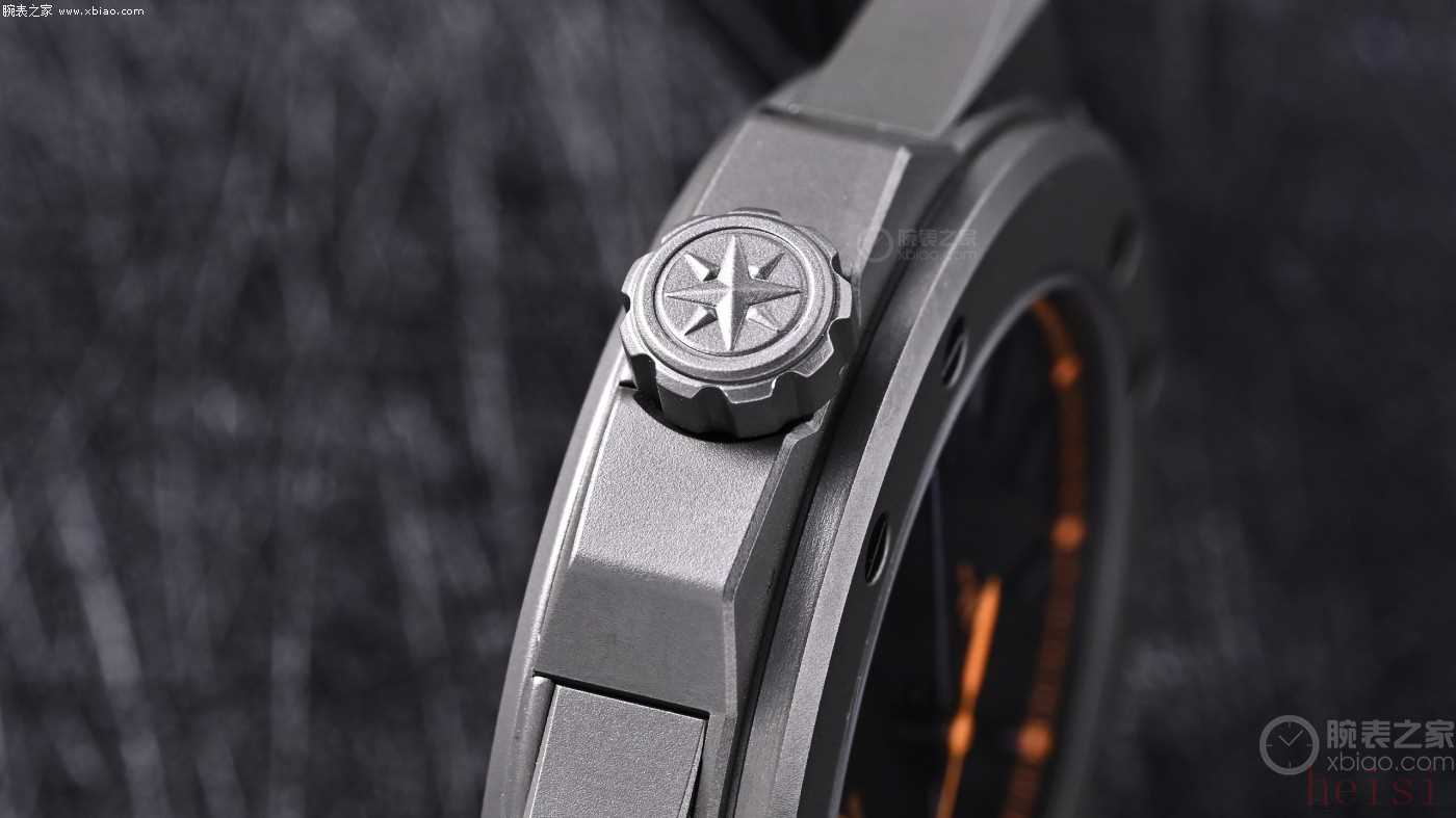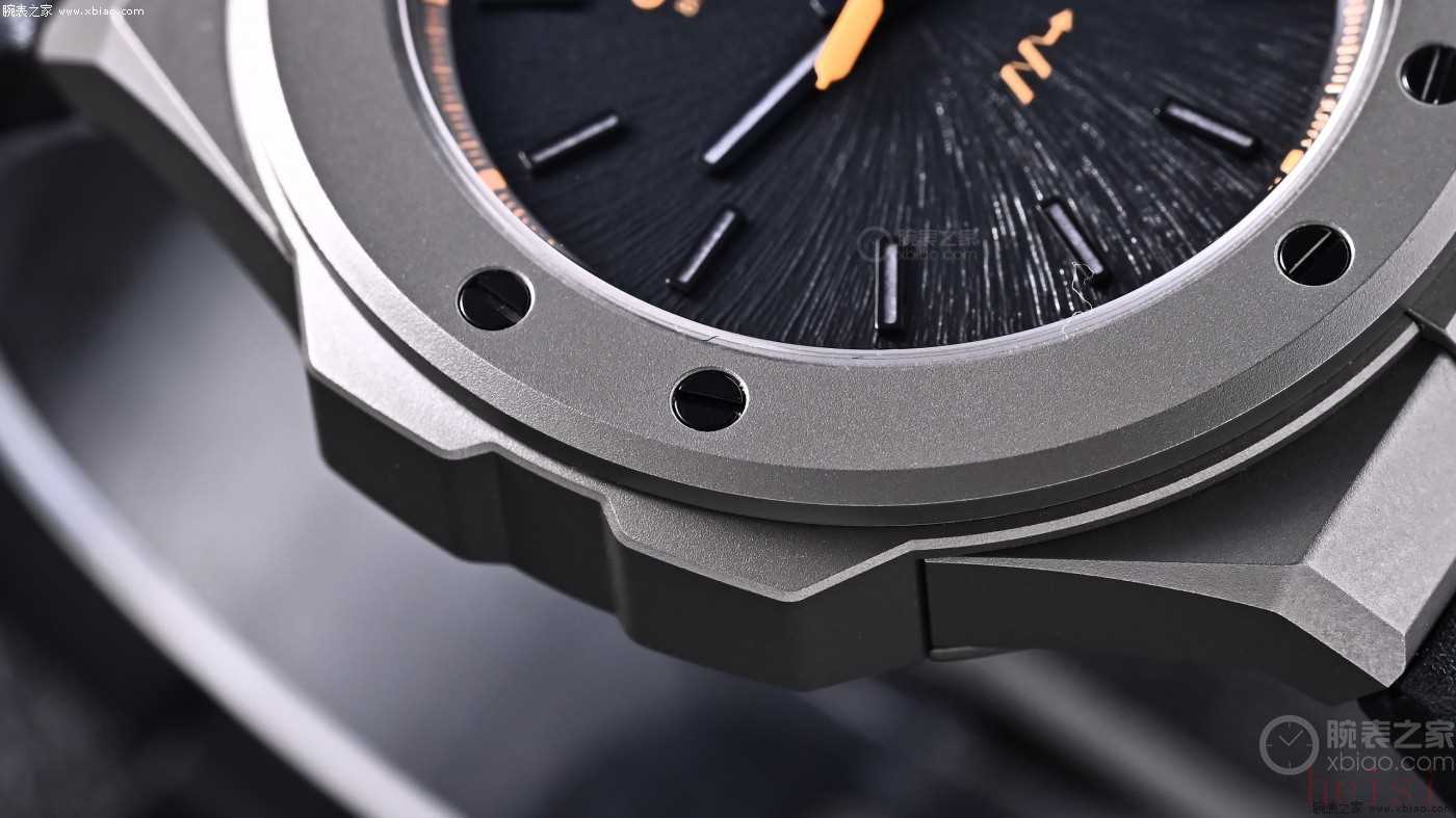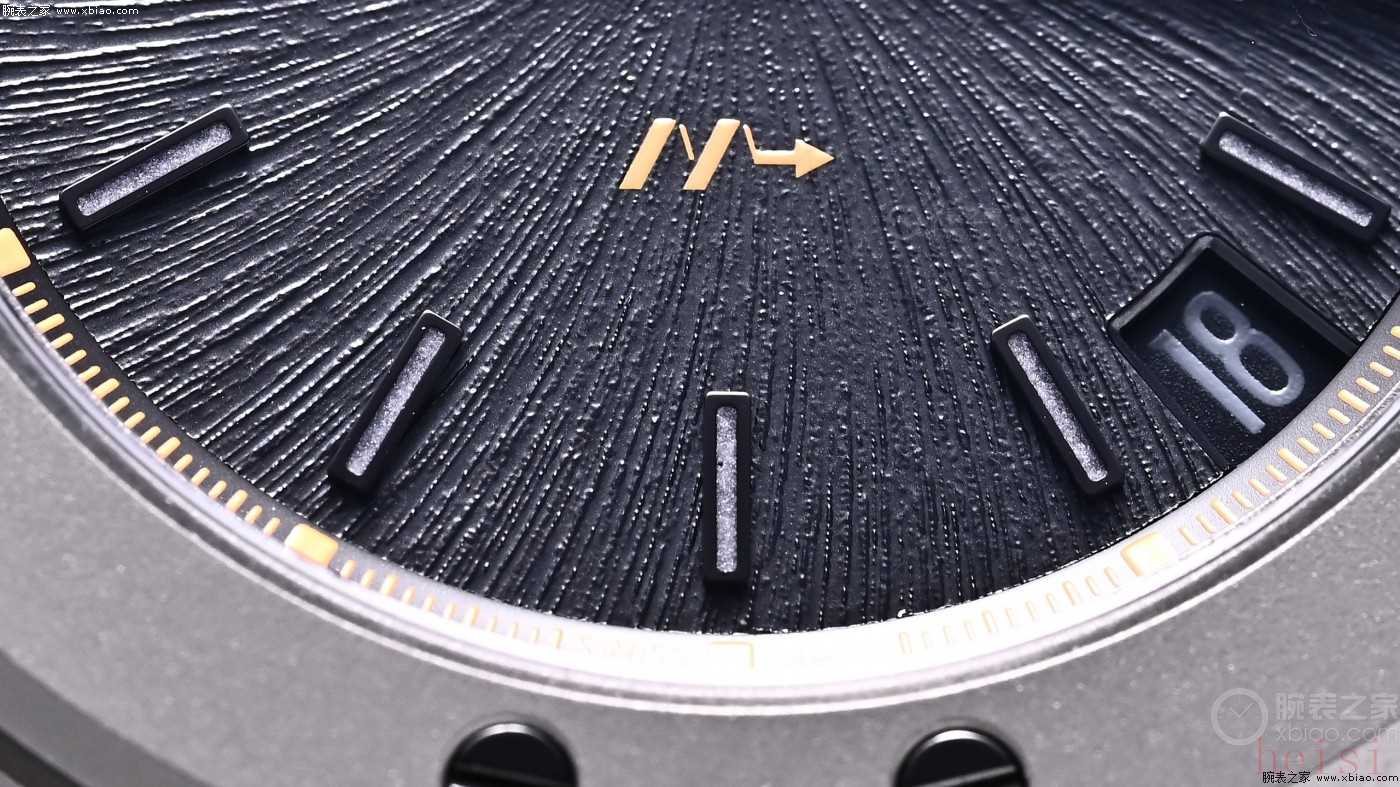 此外,通过实拍图可以看到,表壳、表圈以及护肩装置都经过了微珠喷砂处理,形成磨砂质感,这种表面处理能够散射光线,从而在视觉上看给人一种简约、柔和的感觉。