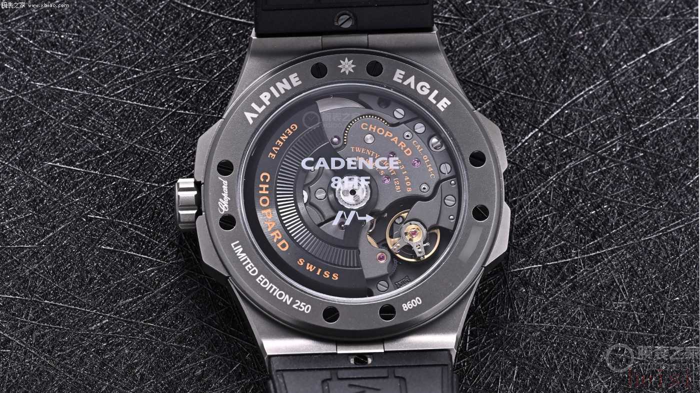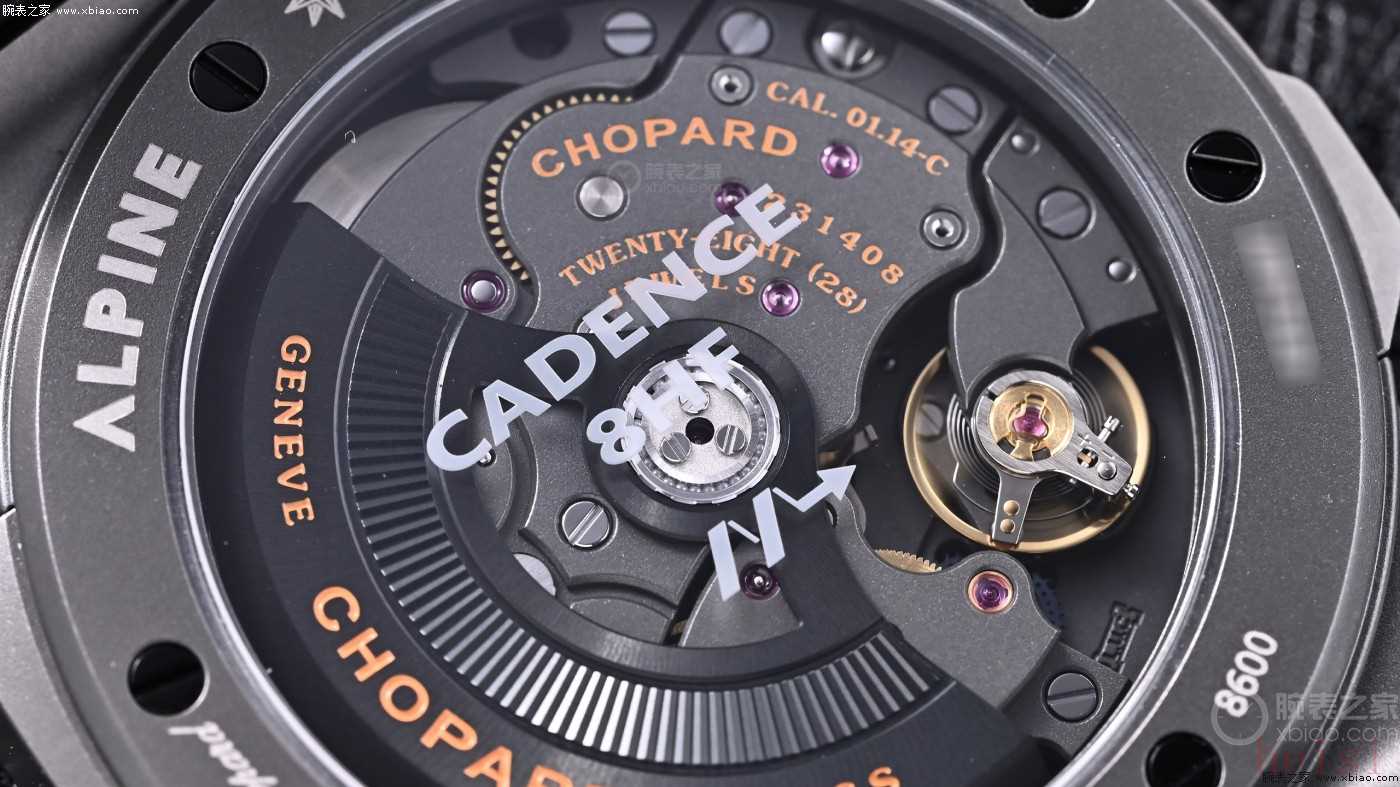 雪山傲翼41 SL Cadence 8HF腕表内部使用Chopard 01.14-C高振频机芯,振频高达57,600次/小时(8赫兹),相比大多数腕表具备的28,800振频(4赫兹),萧邦01.14-C机芯的振频整整高出两倍。