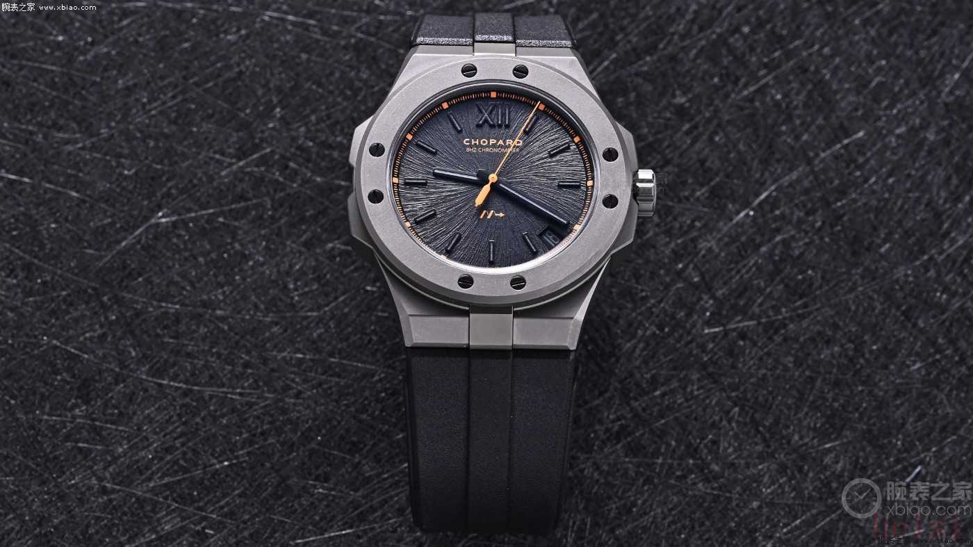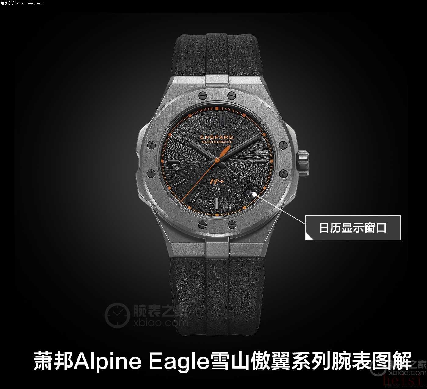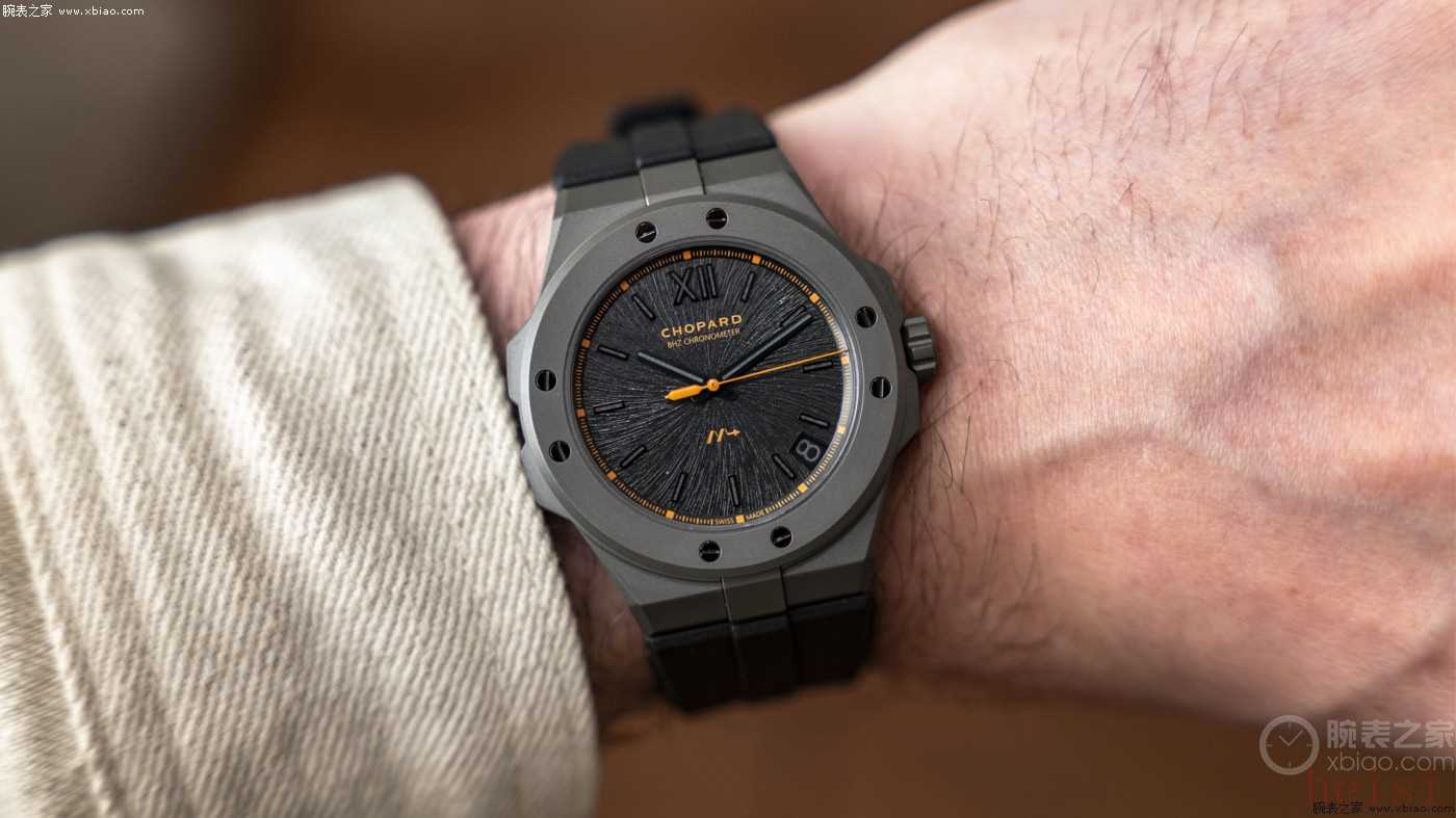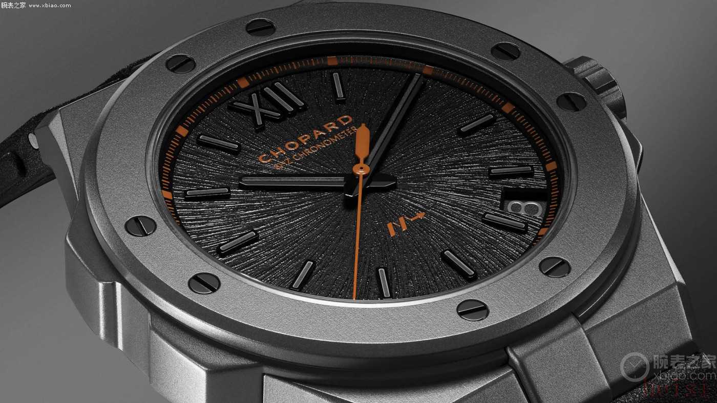 腕表表盘采用“伯尔尼纳岩灰”颜色,萧邦从伯尔尼纳山脉的岩石中获得灵感,用沉稳的烟灰色调致敬阿尔卑斯山脉岩峰的深邃质感。不过,如果整只表全部采用灰色系,看起来也许会“沉闷”,为此萧邦将秒针和分钟轨道以橙色装饰,一下子就让整个表盘“活”了起来,看起来更加动感。我个人非常喜欢这只表的盘面设计,深灰与亮橙色的搭配,就像夜色迎来第一道阳光,慢慢照亮山的边缘,雄鹰飞越山顶,也被阳光染上了一层橙色。