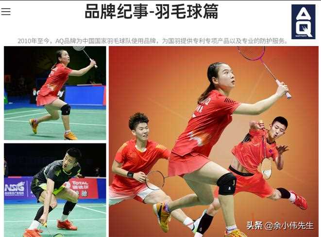 11、AQ-SUPPORT:“让运动员在安全的防护下尽情享受运动,降低运动损伤风险,提高运动质量并延长运动寿命”正是AQ的品牌理念与核心精神。AQ深知研发与创新是践行品牌核心精神的关键,因此不遗余力研发革新,相继推出独树一帜的全球专利产品。2010年至今,AQ品牌为中国国家羽毛球队使用品牌,为国羽提供专利专项产品以及专业的防护服务。2017年,AQ签约NBA联盟全明星球员“字母哥”扬尼斯·阿德托昆博为品牌形象代言人,并字母哥来到中国与粉丝进行亲切互动,完成了字母哥的第一次中国行。2018年,AQ更加关心青训市场,在多个项目领域开拓了AQ品牌的青训训练营。2019年,AQ推出全新的三合一健身手套,其中的专利技术为健身爱好者提供更好、更专业的防护体验。